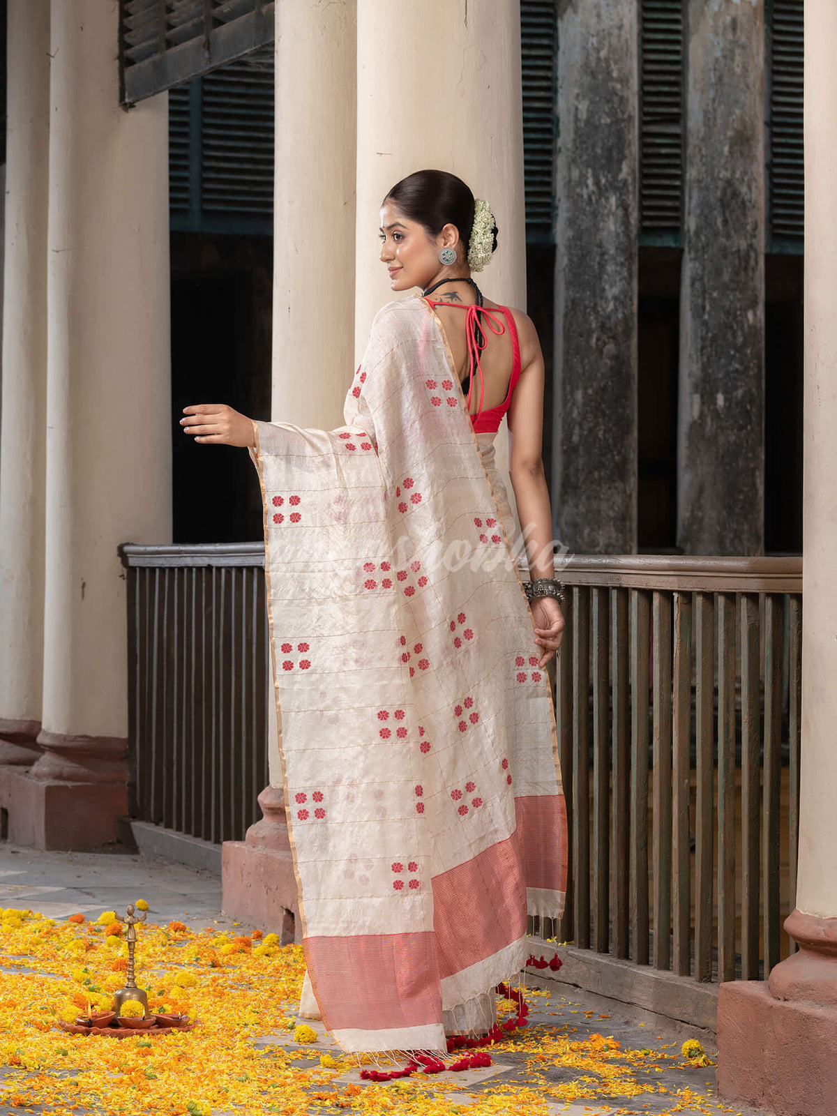 White Tussar Silk All Body Red Handwoven Buti Jamdani Saree