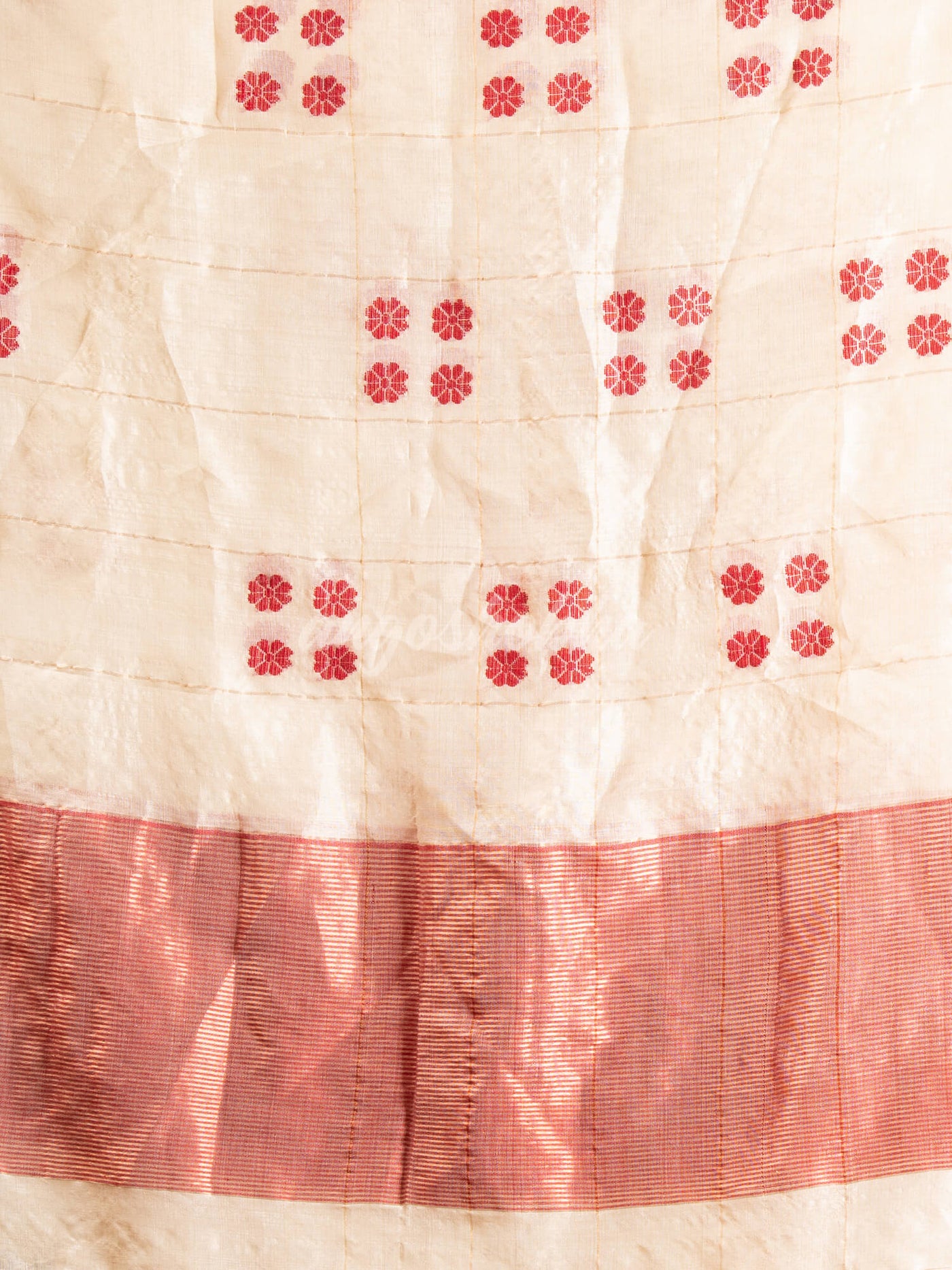 Description: Accentuate your ethnic ensemble by wearing this saree from Angoshobha. Sarees have their own grace, specially this one.This saree from Angoshobha is a beautifu white colour jacquqrd Tussar saree. The all saree kota chek and red colour jacquard flower motif. with golden zari colour chain border. and pallu strip and flower motif. The saree comes with a White colour running blouse piece. You can wear any festival moment with wonderful enjoyment. so collect this product and enjoy with werring tussar saree.