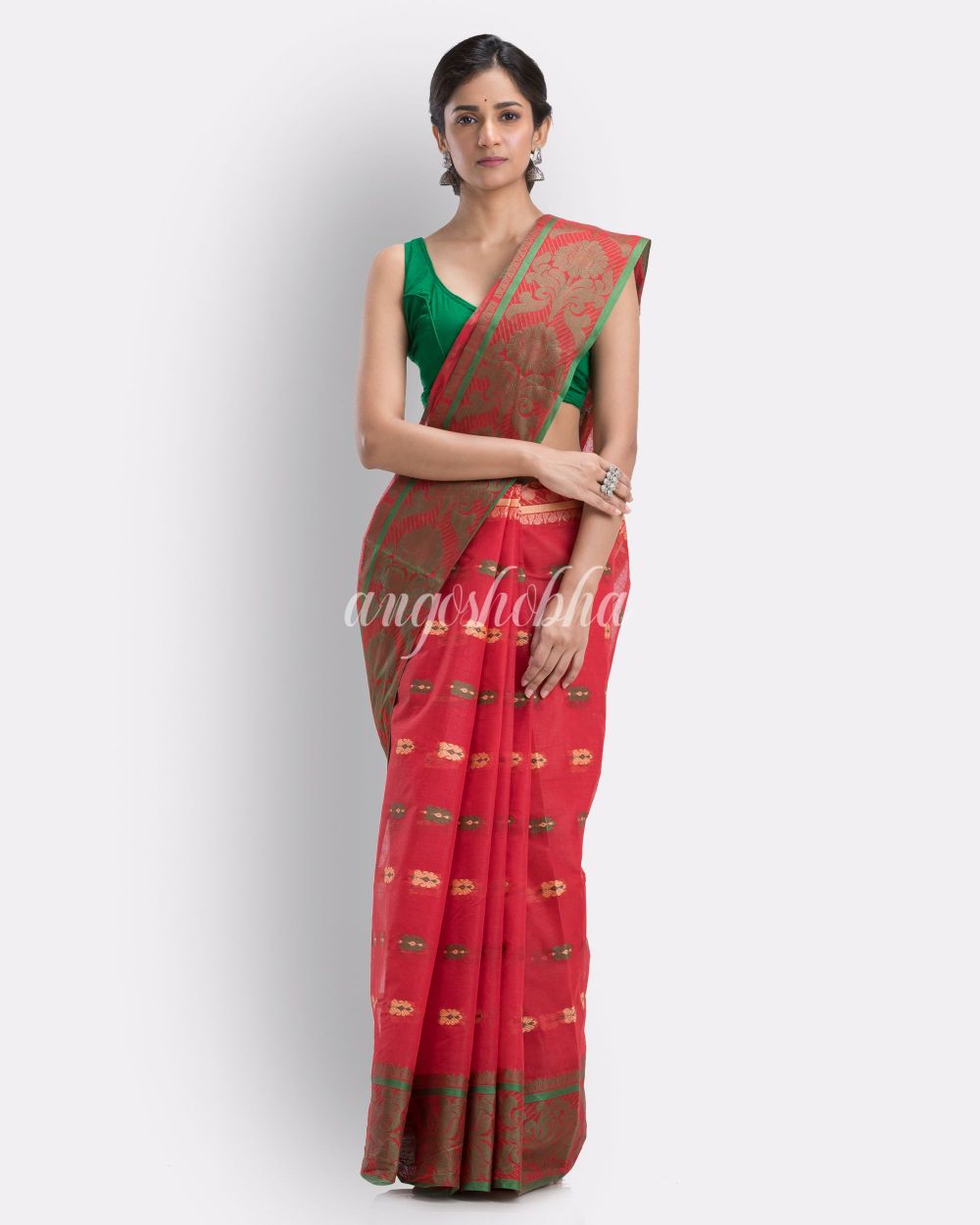 Description: Accentuate your ethnic ensemble by wearing this saree from Angoshobha. Sarees have their own grace, specially this one. This saree from Angoshobha is a beautiful maroon hand loom saree with jacquard weaving work  green strikes with maroon including unique design border all over. The hem of the sari is disguised with maroon with motifs included with an unstitched blouse piece. Crafted in a cotton fabric, this beauty gives the most comfortable fit. Style it with minimal jewellery and high heels to slay the ethnic look.You can wear anywhere and any festival moment with wonderful enjoyment.So collect this product and enjoy with wearing cotton saree. Obviously you can trust on this collection. We are always with your fashion and choice.