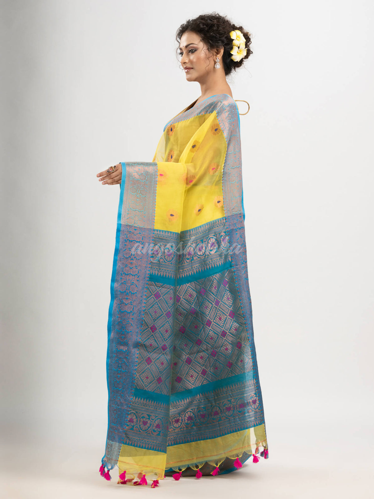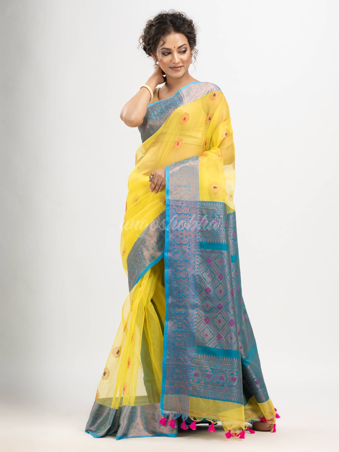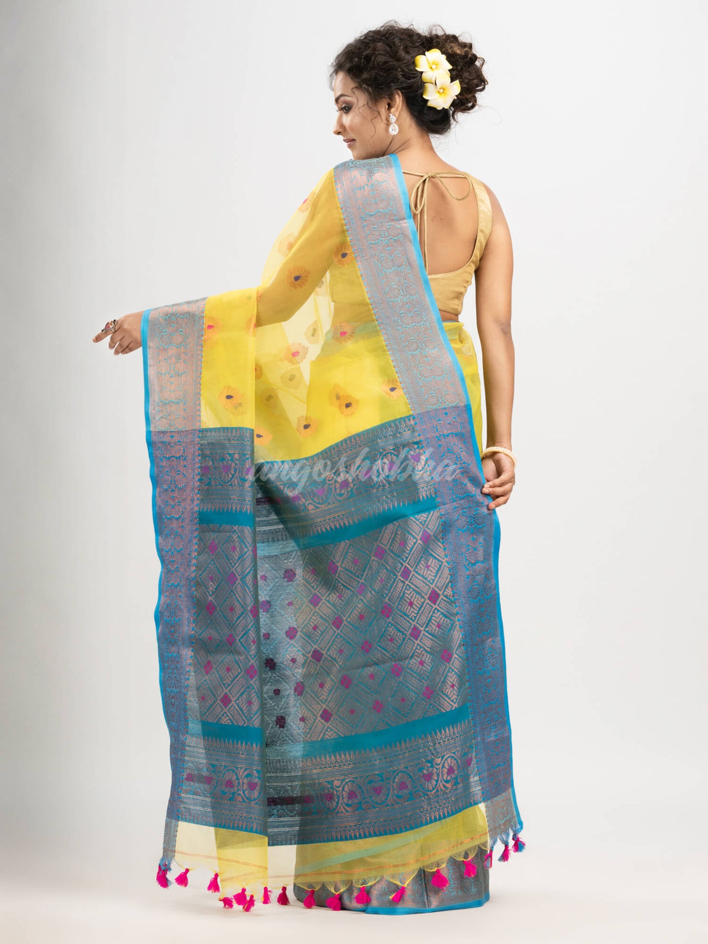 Description: Accentuate your ethnic ensemble by wearing this saree from Angoshobha. Sarees have their own grace, specially this one. This saree from Angoshobha is a beautiful Yellow colour banarasi Design saree. The saree all body jacquard flower buti. The saree is firoza colour border ,in jacquard work.with pallu golden zari colour jacquard Work. With firoza colour blouse piece attached. Crafted in a art silk fabric, this beauty gives the most comfortable fit. Style of it with minimal jewellery and high heels to slay the ethnic look.You can wear anywhere and any festival moment with wonderful enjoyment.So collect this product and enjoy with wearing art silk saree. Obviously you can trust on this collection. We are always with your fashion and choice.
