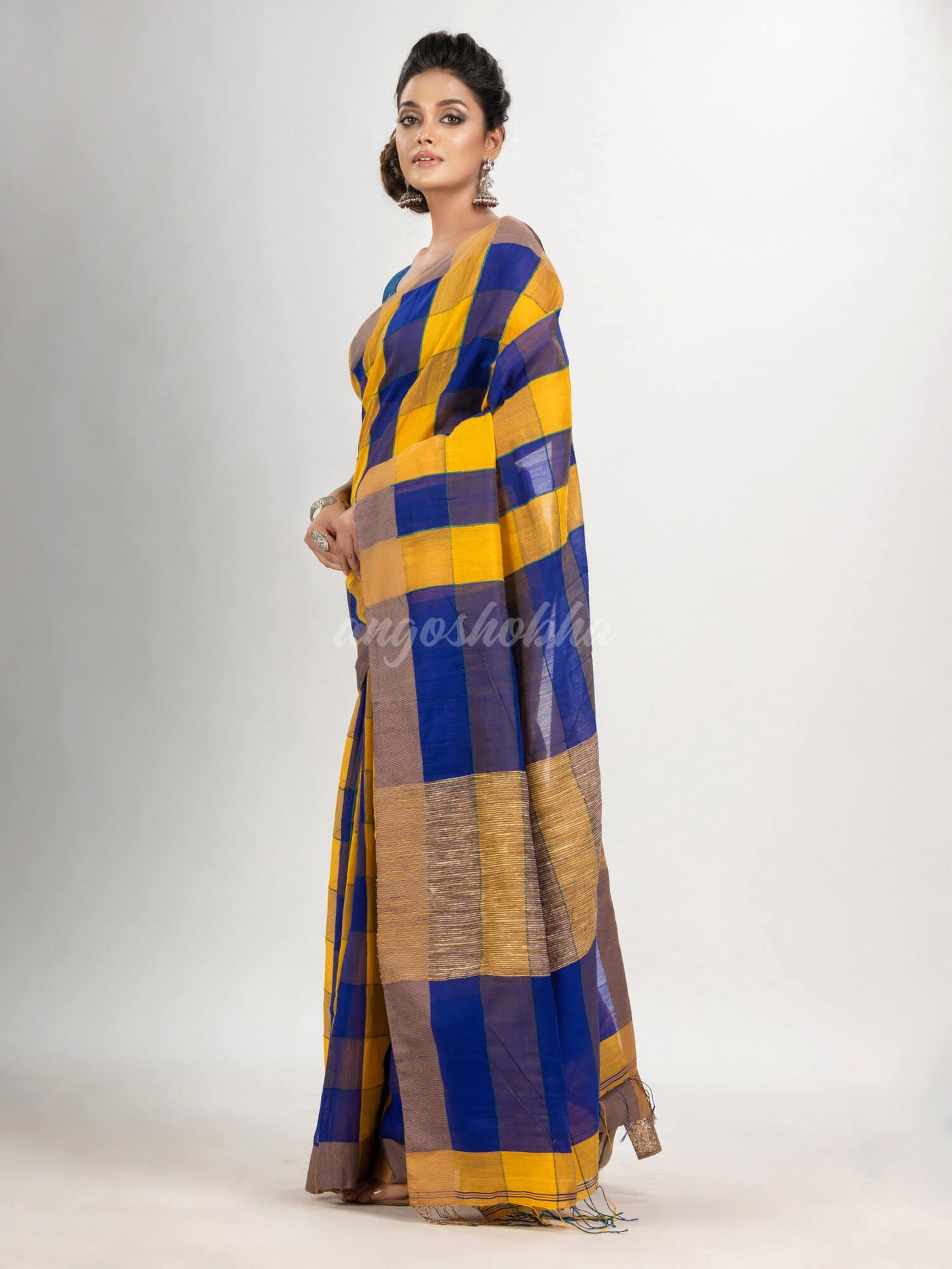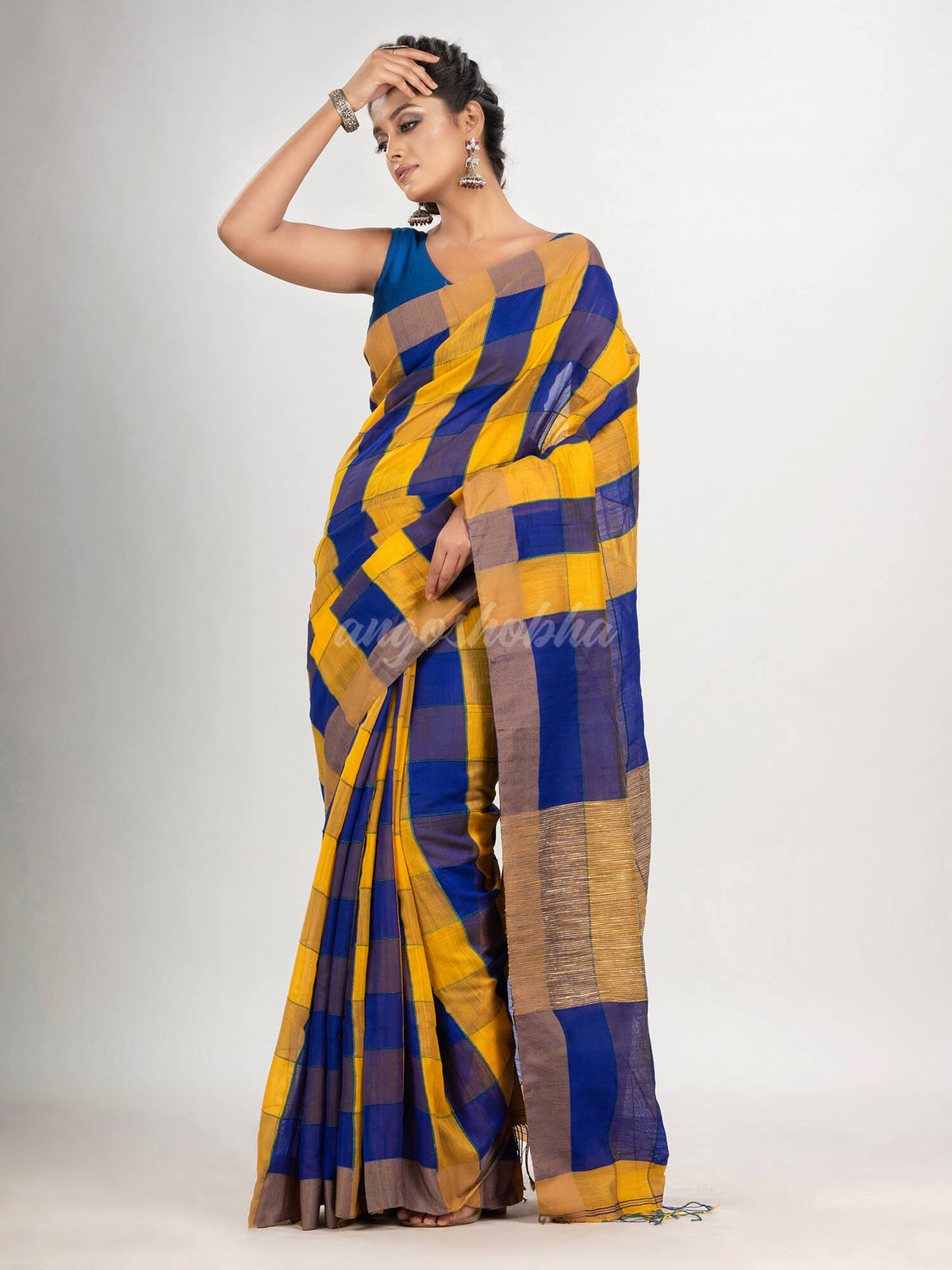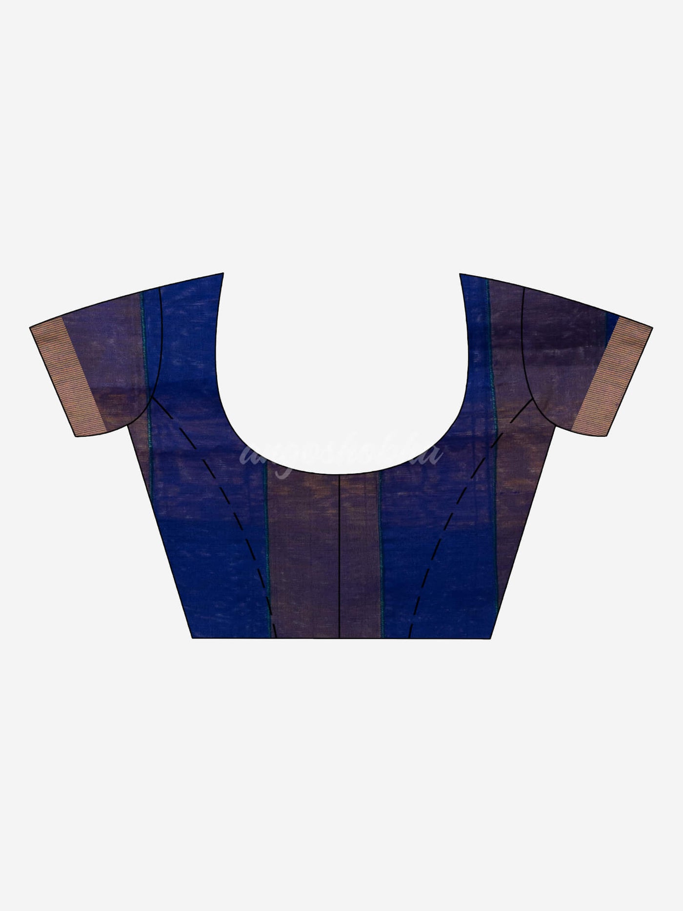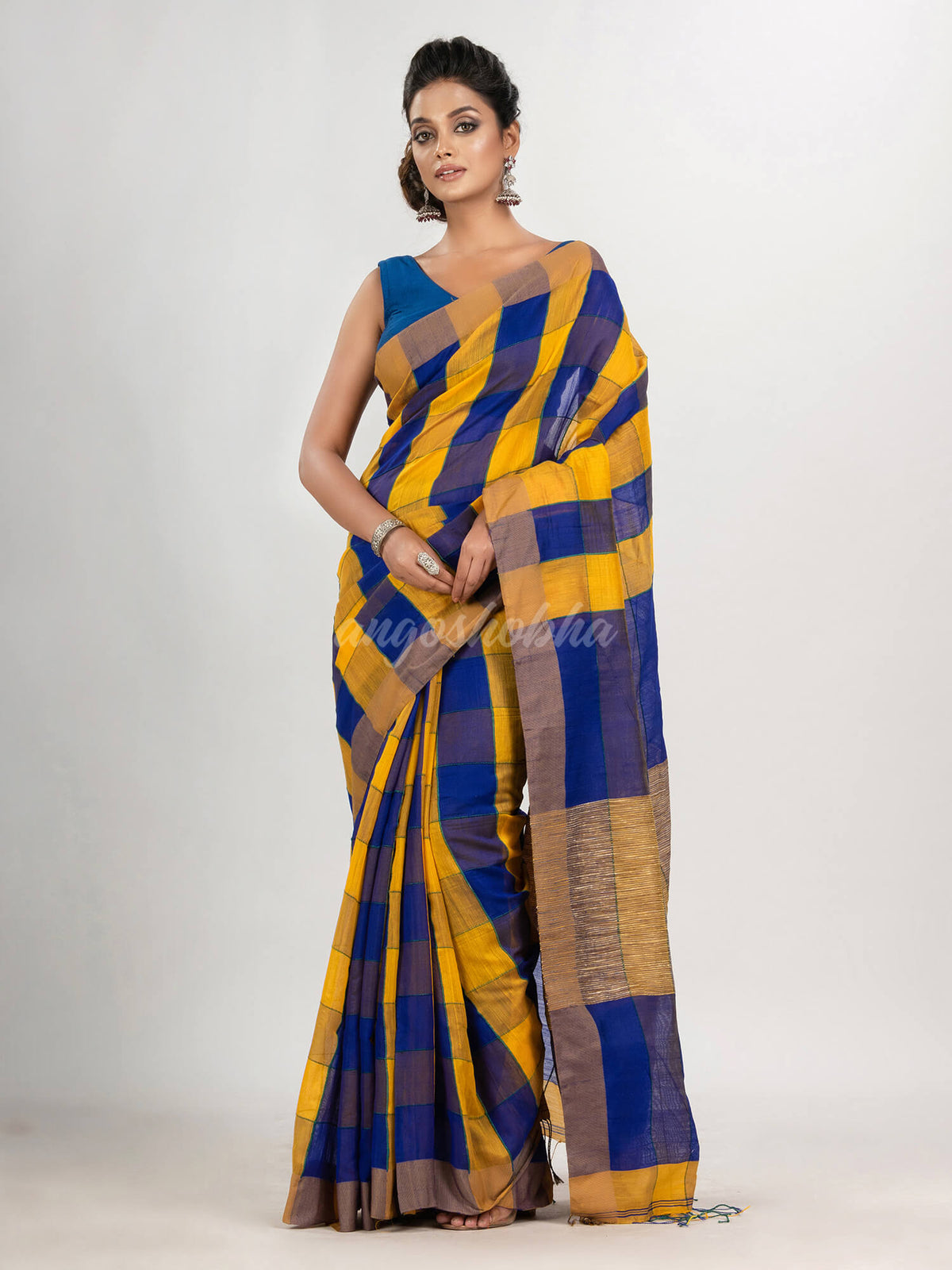 Description: Cotton is spun into yarn which is used to make different types of textiles. The border is hatched with  Yellow colour the hem is disguised with multi color stripes hand weaving work.It is attached with a blue  blouse piece. Cotton is the most widely used natural fiber used for making textiles and is grown in many states of India. Due to its supple, lightweight, comfortable and airy material Indian cotton sarees are worn all over India as daily wear and office wear. Due to its relaxing, feeling and comfort it is worn by women in everyday basis.So buy this product now.