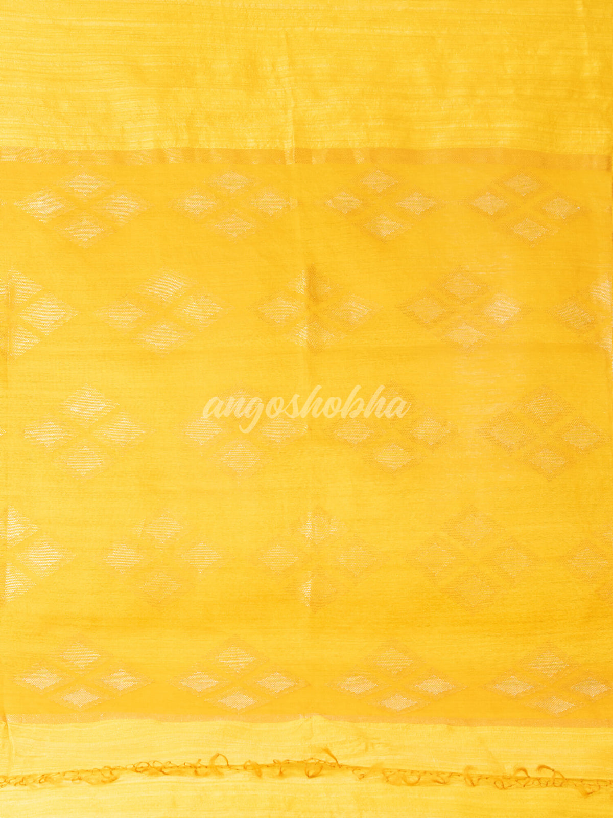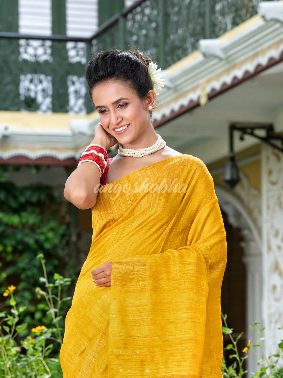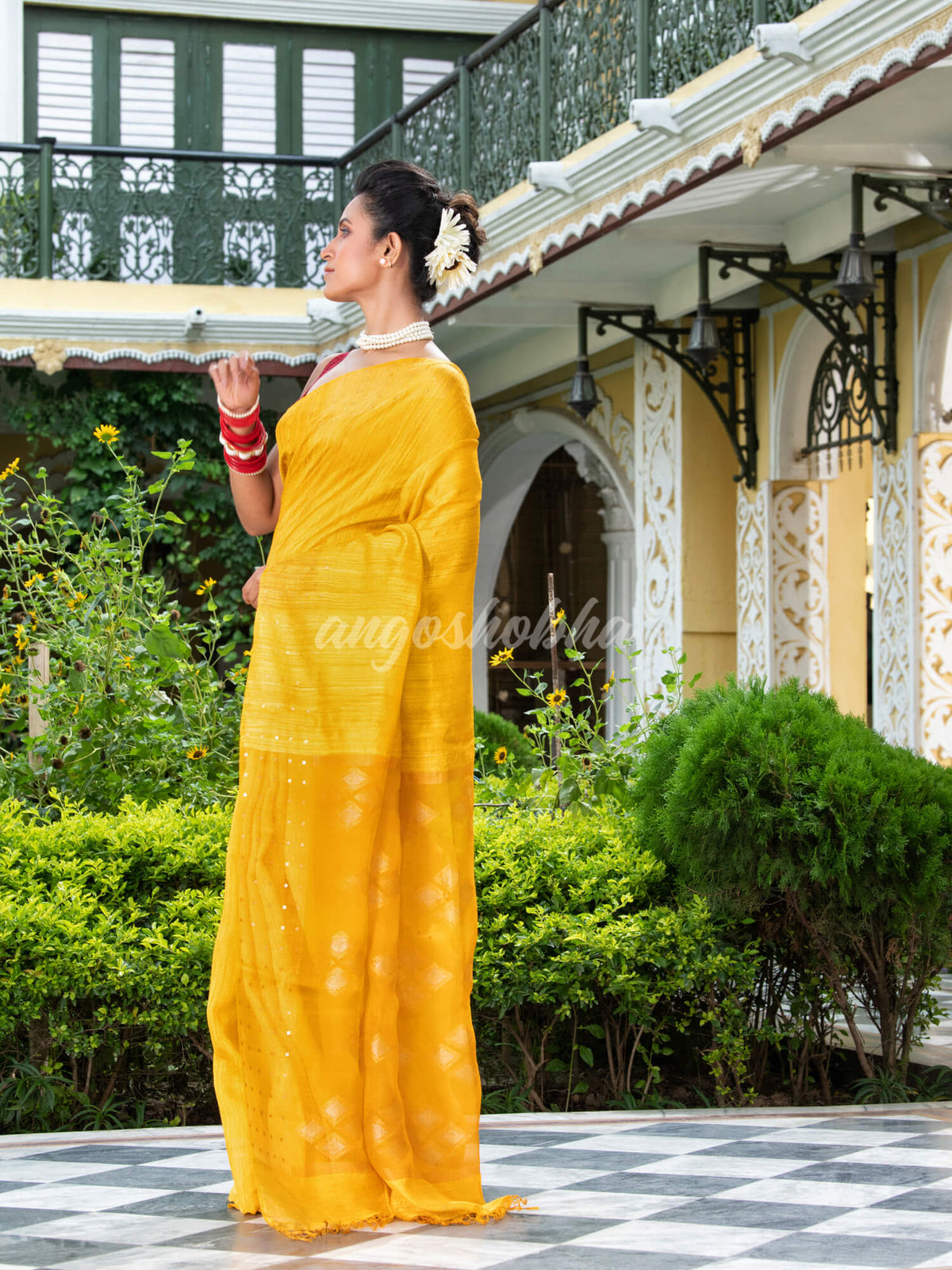 Angoshobha’s ethnic Yellow Matka Silk Handloom Saree comes with an unstitched blouse piece, which can be stitched according to your taste and preference. This Yellow Color sequins saree is crafted by skilled craftsmen using high quality matka silk fabric without compromising on its quality. The border of the saree is disguised with yellow color and the hem of the pure matka silk sarees is concocted with yellow and silver strips with latest printed design color. matka silk jamdani saree is very comfortable in summer and suitable for festivals with this beautiful design and fabric, this saree and blouse set will fetch you Oodles of compliments and praises
