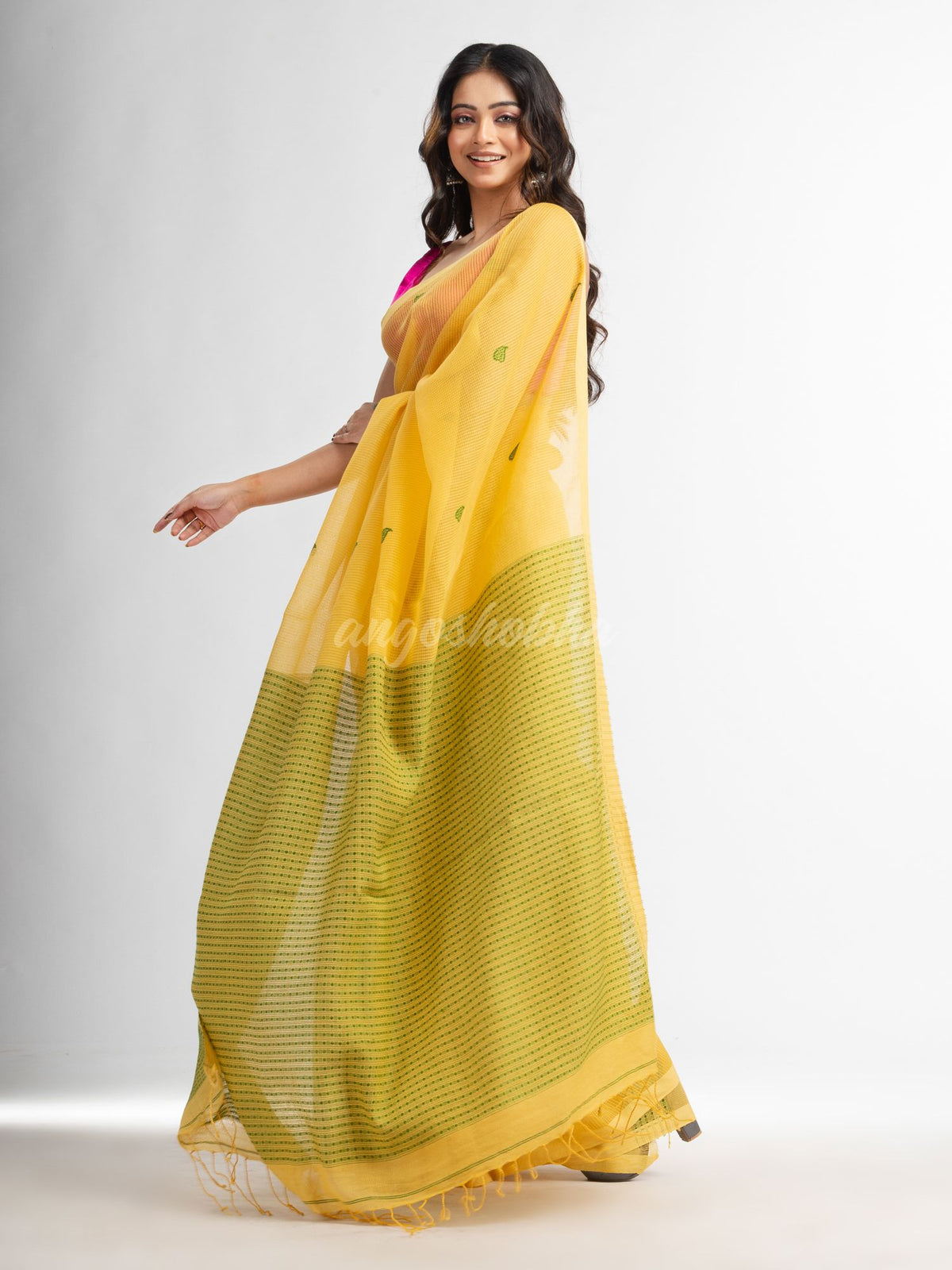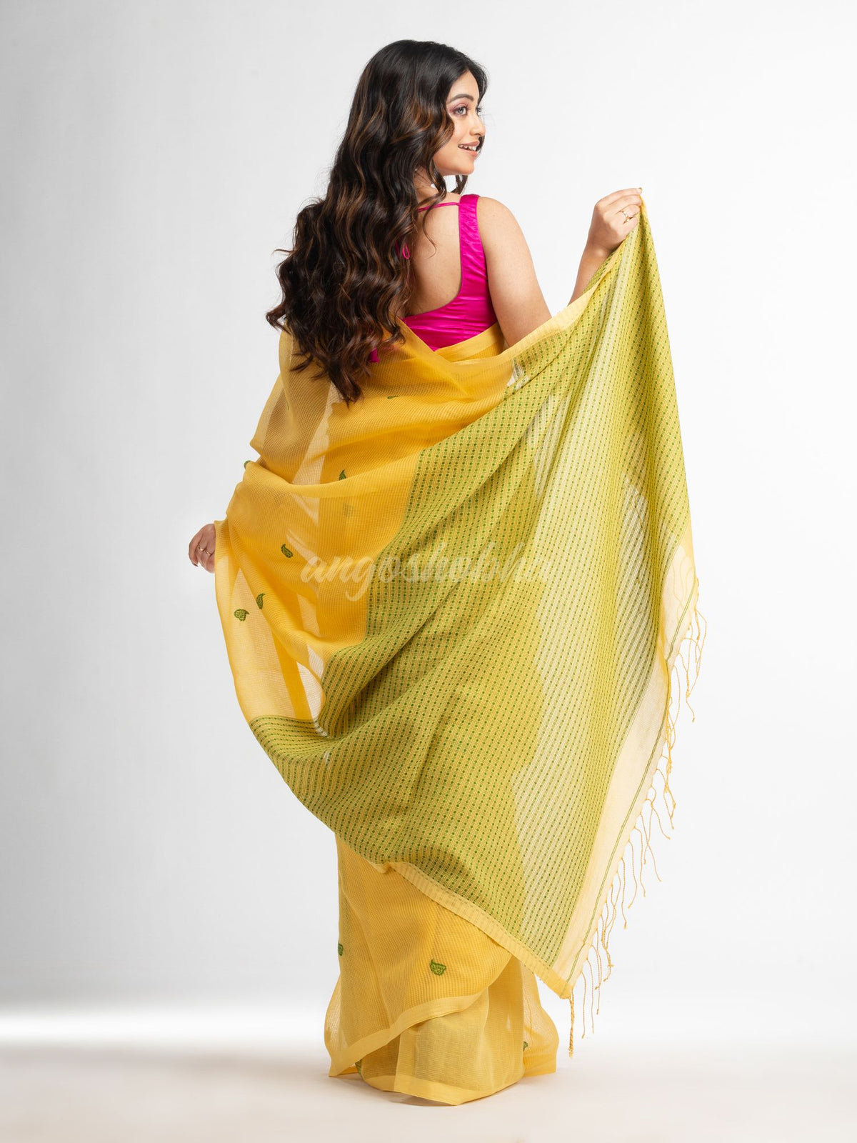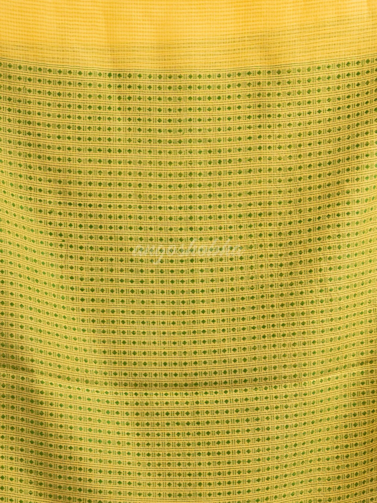Description : Cotton is spun into yarn which is used to make different types of textiles. Cotton is the most widely used cotton blend fiber used for making textiles and is grown in many states of India.this Yellow resham cotton kota jacquard  handwovon saree.The border of the saree is yelow .The all body kota check of the saree is completely covered with green colour leaf motifs.it is attached with yellow colour blouse picec. working the jacket on the hem of the saree.