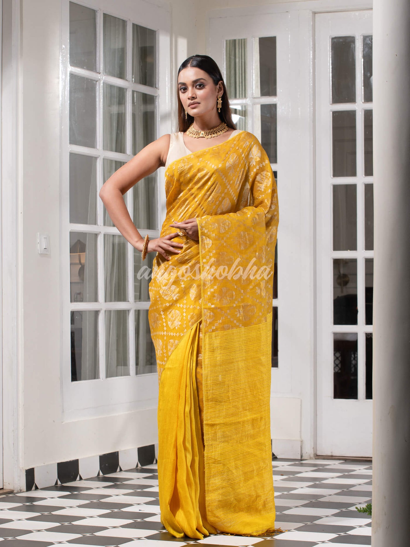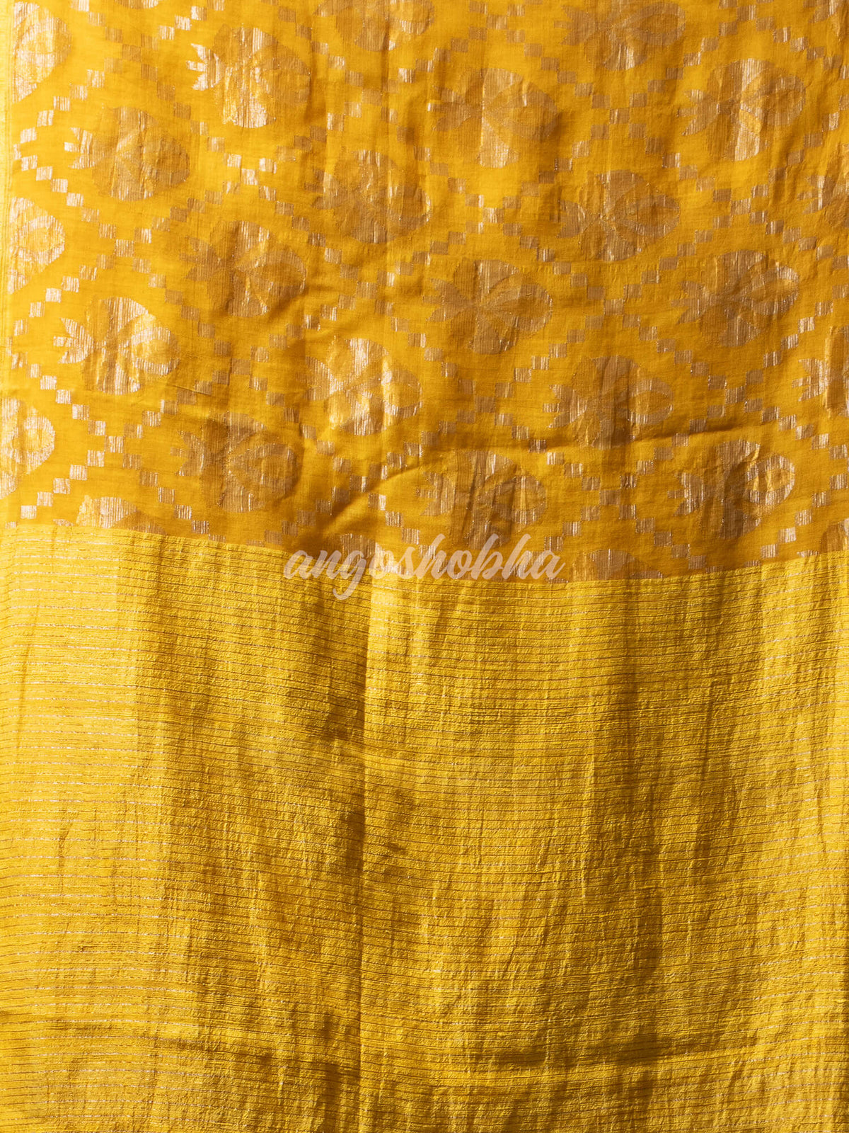 Yellow Silk Matka Body with Leaves Intricate Design including Silver & Golden Stripes on Check Pallu Handwoven Saree